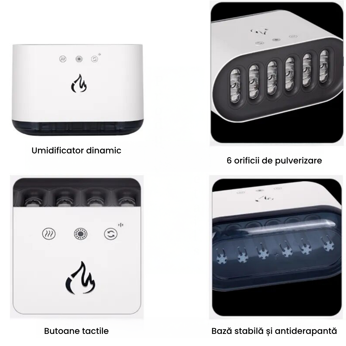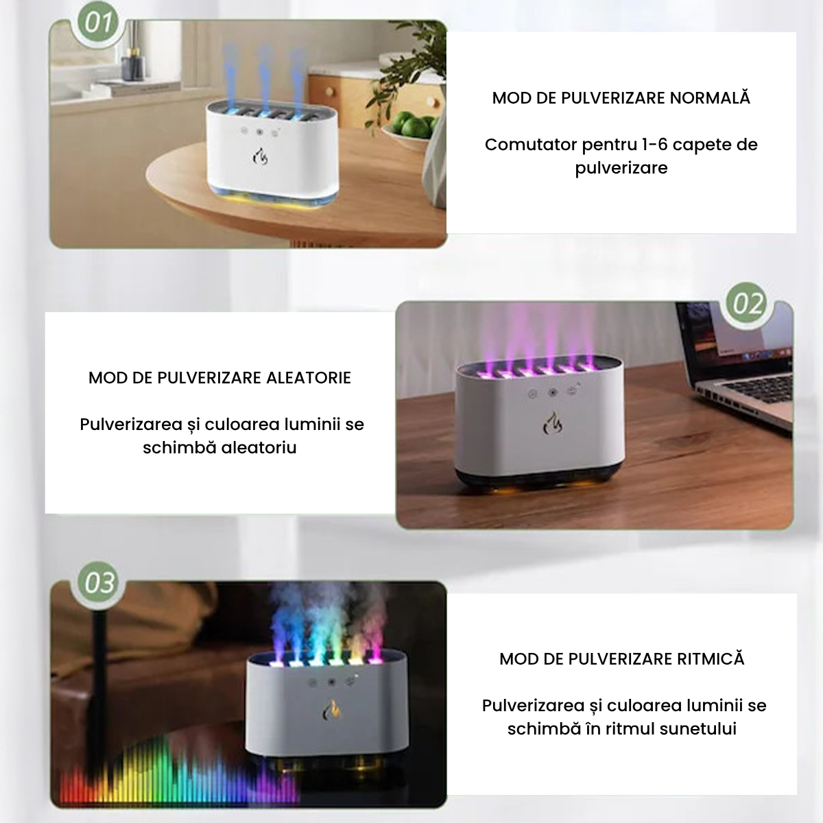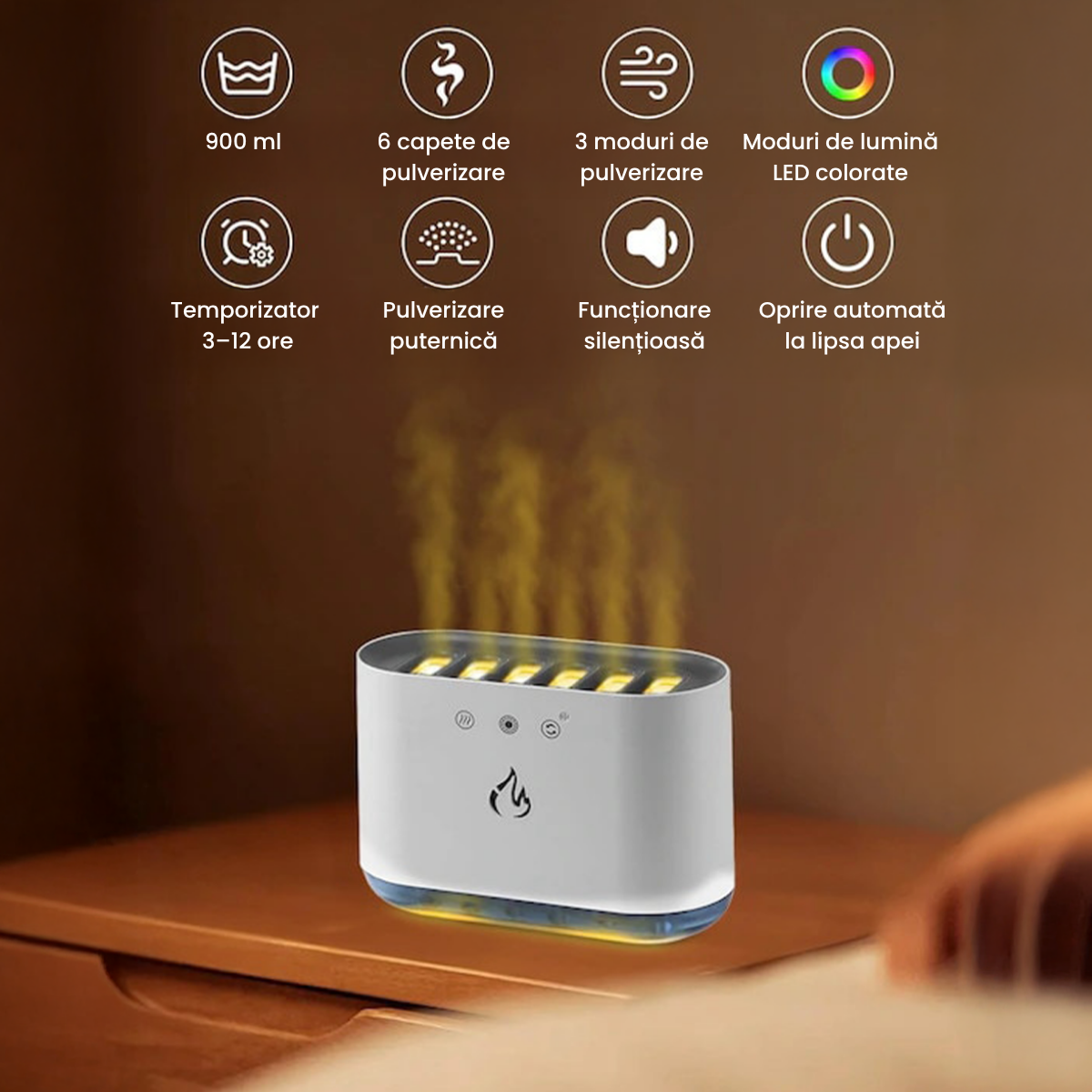 Emite o ceață fină care hidratează aerul și reduce disconfortul cauzat de uscăciune.