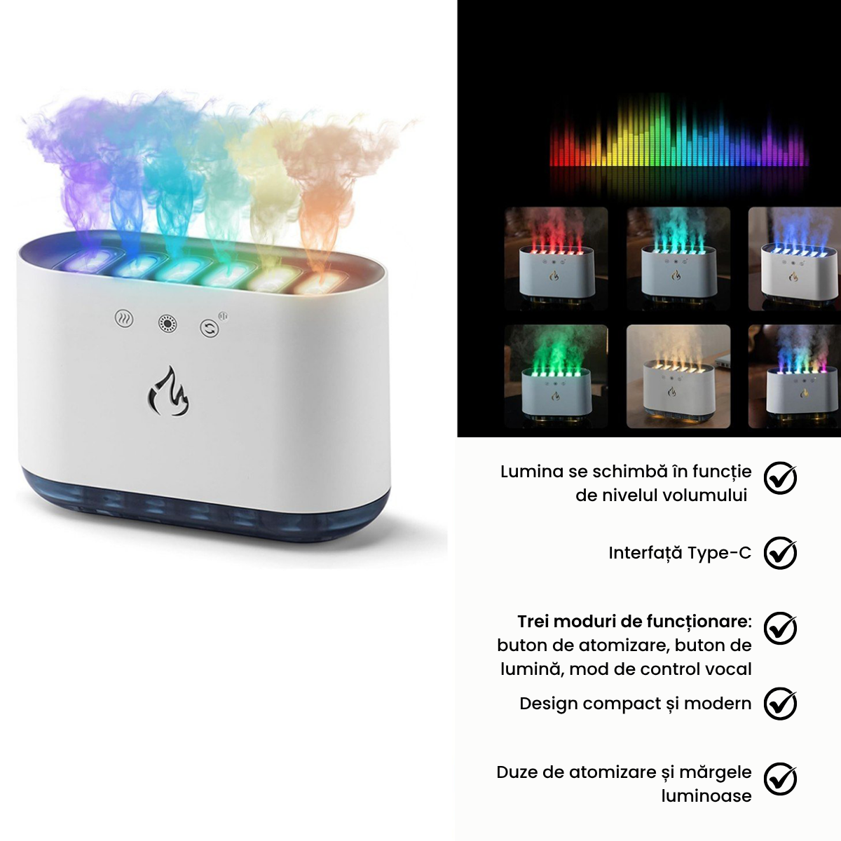 Umidificator de Aer 900ml, Difuzor Aromaterapie cu 7 Culori cu Adaptare Sonora